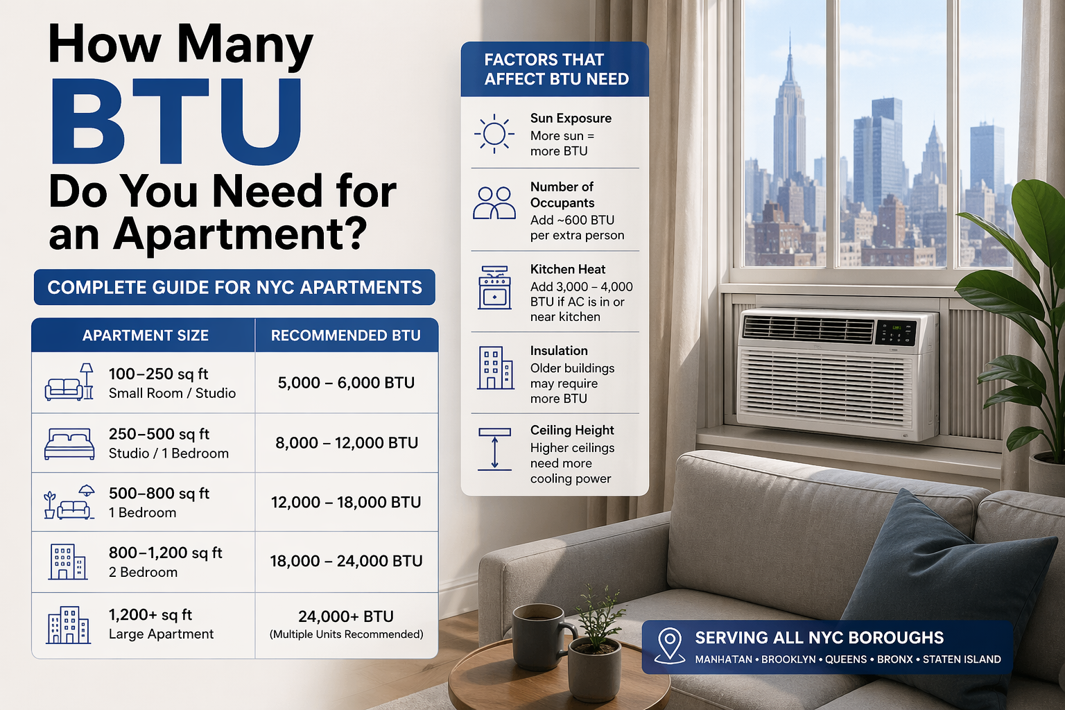 This guide explains how many BTU you need for an apartment, how to calculate it correctly, and how real-world factors in New York City apartments affect sizing